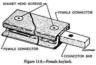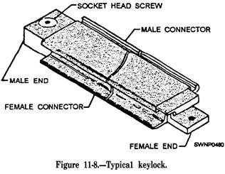 Figure 11-7.-Starter keylock. are furnished in 3-foot, 9-foot, and 12-foot lengths to allow for the staggering of joints in matting patterns. The starter keylock is coated with a nonskid material. It is not used in installations having a guide rail. TYPICAL KEYLOCK.- A typical keylock (fig. 11-8) is inserted every 100 feet in the pattern to permit the easy removal of sections of the matting for a multiple-mat replacement. For this reason, only a maximum of 50 feet of any one section needs to be removed to replace mats that could not economically be replaced as individual units by replacement mats. Typical keylocks are furnished in 3-foot, 9-foot, and 12-foot lengths to allow the staggering of joints of matting patterns. The typical keylock is coated with a nonskid material. FEMALE KEYLOCK.- A female keylock (fig. 11-9) is used to join two adjacent male mats. The female keylock is coated with a nonskid material.