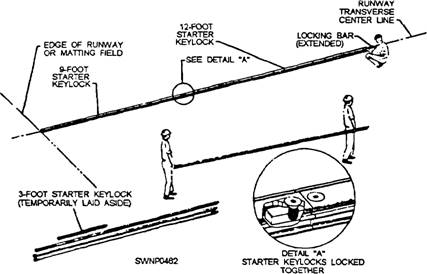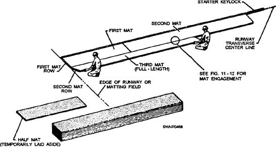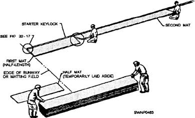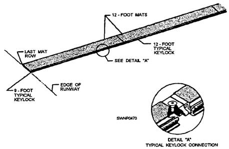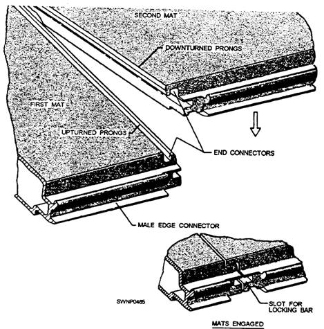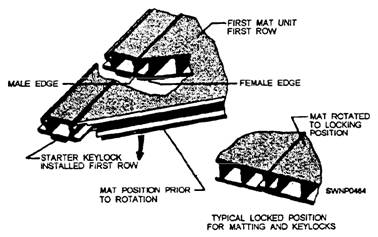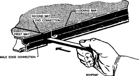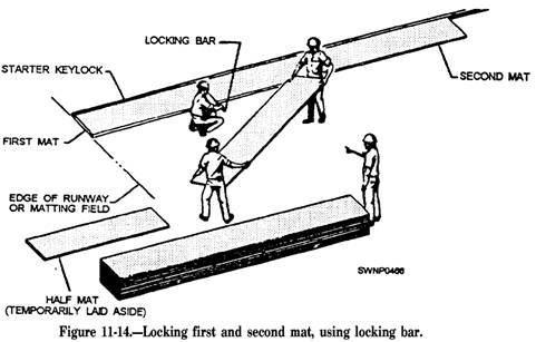 Steps for Laying AM-2 Mats and Keylocks The procedure for laying AM-2 mats and keylocks is shown in figures 11-10 through 11-18 and consists of the following steps: 1. Lay starter keylocks on the transverse center line of the runway. (See fig. 11-10.) A 9-foot starter keylock is laid at the outer edge of the runway. Remove the socket head screws from the keylock to allow for extending the locking bars into the next keylock section. 2. Place a 12-foot starter keylock next to, and aligned with, the 9-foot section. Move the 12-foot section against the 9-foot section, and adjust the locking bar so the socket head screws secure the locking bar in each section this procedure secures the 9-foot starter keylock and the 12-foot starter keylock, as shown in detail "A" of figure 11-10. 3. Repeat laying six more 12-foot sections and one 3-foot section of starter keylocks to complete the 96-foot width of the runway. NOTE: Initially, lay several transverse rows of AM-2 matting in one direction only from the starter keylock row. If matting is started on both sides of the starter keylock, a seesaw force could result, disturbing the alignment of the entire field. 4. With the nonskid side of the mat turned up and the upturned prongs on the right, align the first mat (half mat) on the left side with the starter keylock (fig. 11-11). Align the downturned prongs with the runway edge. Hook the female edge of the mat into the groove on the starter keylock (fig. 11-12) while holding the mat in an angular position. Rotate the mat downward to form the joint. (See fig. 11- 12.) 5. Lay the second and all successive mats the same way as the first mat (fig. 11-11) in relation to the starter keylock. The downturned prongs of the second mat should mate with the upturned prongs of the first mat, as shown in figure 11-13. When the mats are properly engaged, a rectangular slot is formed by the engagement of the end connectors. 6. Lock the first and second mats together, as shown in figure 11-14, by inserting the locking bar (fig. 11-15). NOTE: The first two mats and all mats in the first row should be aligned accurately before inserting the locking bar. Misalignment of mats will prevent proper installation of the second row. Locking bars may stick
