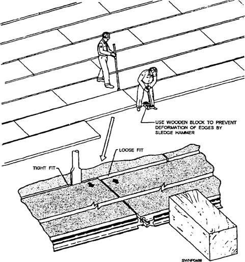 Figure 11-17.-Correction of mat misalignment. against the mat edge before striking, as shown in figure 11-17. 10. Every 100 feet, install a row of typical key-locks in the matting field (fig. 11-6). Place a 9-foot typical keylock at the outer edge of the runway with the female end of the keylock aligned with the first mat of the preceding row (fig. 11-1 8). Engage the female edge of the typical keylock with the male edge of the mat in the preceding row (similar to fig, 11-12 and step 4). 11. Place a 12-foot typical keylock next to the installed 9-foot typical keylock. Move the 12-foot section against the 9-foot section after first engaging the female edge of the keylock with the male edge of the first twoo mats in the preceding row. Raise the socket head screw in the male end of the 9-foot key-lock until the threaded hole in the female end of the 12-foot key-lock is aligned. Then secure the socket head screw in the 9-foot keylock, using the socket head screw wrench. See detail "A" of figure 11-18 that shows the typical key-locks secured together. Repeat laying of six more 12-foot sections and one 3-foot section of the typical keylocks to complete the 96-foot width of the runway. NOTE: After the laying of a row of typical keylocks every 100 feet, continue laying AM-2 matting, according to steps 4 through 9, to the ends of the runway. Runway APPROACH APRONS are required at each end of the main runway. These aprons are ramps made of mats placed to prevent the tail hook of a low