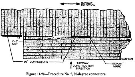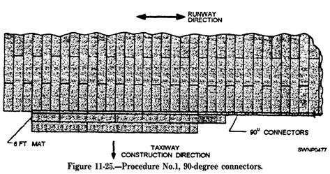 Field-Laying Procedure The sequence for laying an entire field is as follows: 1. The main runway 2. The lateral taxiways 3. The taxiway that is parallel to the runway 4. The parking stands and storage areas The above sequence may be modified in the interest of gaining time in the overall installation by laying the main runway and the parallel runway at the same time. Then the lateral taxiways and parking area can be installed. CAUTION If the latter procedure is to be used the distance between the runway and its parallel taxiway must be carefully controlled Since the mat width is 2 feet, a gap of almost 1 foot could occur at each end of the interconnecting lateral taxiway. The gap between the lateral taxi way and the long taxiway and runway should not exceed 2 inches. RUNWAY-TAXIWAY CONNECTIONS.Install W-degree connectors on the edge of the runway at the point where the lateral taxiways will connect with the runway. The 90-degree connectors may be used at other points where two mat-laying patterns, at 90 degrees to each other, are to be joined. NOTE: The 90-degree connectors can be used to connect the end of the lateral taxiway with the long taxiway also. The two procedures for installing 90-degree connectors are as follows: PROCEDURE NUMBER 1. Where the adjoining pattern has not been laid, install a sufficient number of 90-degree connectors along the 2-foot edge of matting, such as the edge of the runway, equal to the width of the taxi way or other section to be joined. Lay a half-length mat into the first 90-degree connector, so the end of the mat matches the end of the connector. Engage the prongs of a full-length mat into the prongs of the half-length mat previously laid and push into engagement with the 90-degree connector. Continue to lay mats in the above manner until the first row is completed to the length of the 90-degree connectors. Additional mats may then be laid in the usual manner. (See fig. 11-25.) PROCEDURE NUMBER 2. Where the adjoining mat pattern has already been laid, adjust the last few rows of matting (of the taxiway), so the space