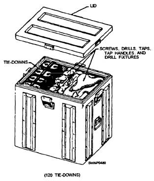 Figure 11-28.-Tie-down container. 4. Tap two holes 3/8 inch, 16 threads per inch, unified national coarse class 313 fit. Finish with the bottom tap to obtain 9/16-inch minimum full-thread length. 5. Store the sleeve and the pilot in the holes provided and secure with setscrews. After the drilling is completed, secure the ring retainer with two socket head screws. PARKING AND STORAGE AREAS.- The parking and storage areas should be installed next. Mats and locking bars are installed in the same manner as the runway and taxi ways, except that the staggered joint pattern is not mandatory. This means that the area can be built up in any random pattern and that all leftover half-length or full-length mats can be used. The 90-degree connectors should be installed between these parking and storage areas and taxiways according to the procedure outlined earlier. Install tie-downs on the matting in these areas, as shown in figure 11-30. BLAST DEFLECTOR INSTALLATION.- To shield the ground area around taxiways and parking areas from the blast effects from aircraft, install blast deflectors as required. Assemble blast deflector adapters to the boundaries of matting that will be