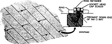 Figure 11-30.-Installing tie-downs in AM-2 matting. either male edges, female edges, prongs-down ends, or prongs-up ends. Three types of adapters are supplied to fit anyone of the joints. Erect AM-2 mats to the exposed upturned edge of the adapters to provide the blast shield. Use the adapters to support each AM-2 mat. (See fig. 11-31.) |