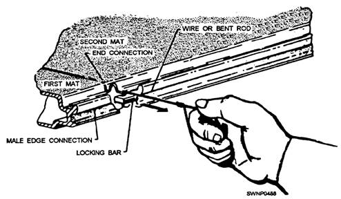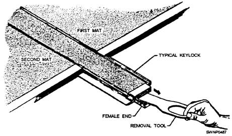 Figure 11-36.-Removal of locking bar. 6. With the clearance now provided, removal of the remainder of the matting and additional guide rail, as necessary to affect the repair, may be readily accomplished Remove the cut piece of guide rail aft of the repair area by removing locking bars and disconnecting the guide rail pins, using a pin remover, NAEC Part No. 414223-1. Slide the guide rail out of the mats. 7. Repair the ground surface, as necessary, before installing the guide rail and new or refurbished matting. 8. The installation procedure must be the same as that for the original installation. Replace the locking bars. 9. Reinstall matting over the repair area until the last row of matting is in place. At this point, this row of matting must be raised in unison with pry bars to permit installation of locking bars. NOTE: It will not be possible to insert locking bars between the guide rail and adjacent mats for this row. Therefore, a replacement mat should be installed next to the guide rail. A locking bar is built into the replacement mat. 10. Insert the typical keylocks in the reverse order in which they were taken out. Always use wood blocking between the hammer and connector if force is necessary to drive the sections into place. Excessive mat deflection and roughness, which can be attributed to cavities under the mats, can be repaired in the following manner: 1. Remove all mats that show excessive wear and deformation according to the instructions given earlier. 2. Fill all cavities under the mats and cover cavity areas with old matting. Areas should be reinforced with any available matting: M9M1, M9M2, AM-1, or damaged AM-2 mats. The mats in the bottom layer need not be joined together to save material and manpower. It is advisable to have the reinforcing mats touching, but it is not imperative that the mats in the bottom layer be interlocked. The mats in the bottom layer must be placed with the long dimension of the mats at right angles to the mats in the top layer. A double layer of matting should be considered in all cases where sandy areas can cause excessive mat roughness due to movement of the sand 3. Replace the top layer of matting according to the instructions given earlier. Before proceeding, note that a heavy-duty mat, as shown in figure 11-37, has been developed