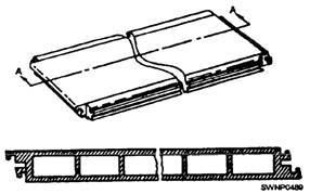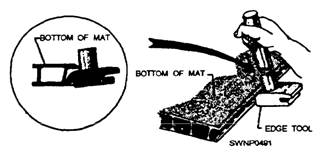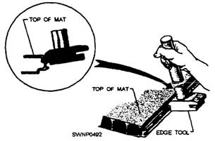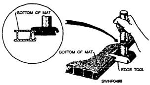 Figure 11-40.-Straightening of male edge. Heavy-duty mats are used under arresting cables to eliminate excessive dents and other external damage that occurs to regular matting during aircraft arrestment procedures. These mats are only used on the end of the runway where aircraft touch down. Heavy-duty mats are 6 feet in length and 18 inches wide after connectors are attached. They are painted Marine Corps green, color No. 23; the top surface is also coated with a nonskid material of the same color. Locking bars used to secure heavy-duty mats together are approximately 6 feet in length. |