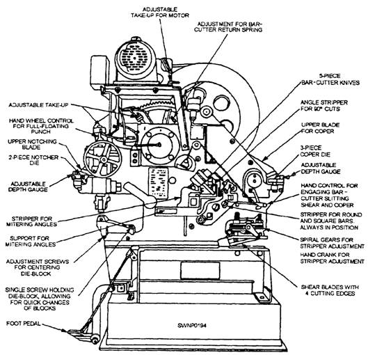 Figure 12-8.-Combination punch, shear, and coper. manufacturer's manual for detailed information concerning the structure, operation, maintenance, and repair of the individual machine. One of the key parts of the vertical band saw is its blade that must be sharp and accurately set to cut in a straight line. The radius of the curve, or circle, to be cut determines the size of the saw blade to be used. Use a narrow blade to cut curves of small radii. A 1/8-inch blade will cut a 1-inch curve; a 3/16-inch blade, a 1 1/2-inch curve; a 1/4-inch blade, a 2-inch curve; and a 3/8-inch blade, a 2 1/2-inch curve; provided, in each instance, the teeth have the correct amount of set. After turning on the power, see that the blade is operating at full speed before you start a cut. It is advisable to true up one face or edge of the stock before taking a cut with the saw. Also, start the cut in the waste stock and do not crowd or cramp the blade. Keep the top guide down close to the work at all times. When sawing curves or straight lines (outlines), you guide the stock along the lines marked on the face of the stock. When more than one piece is to be sawed, several can be tack-welded together before sawing. Tack-weld from the side on which the outline is marked so the welds will be visible to the saw operator. Be careful not to exceed the rated capacity of the machine. Do not force the material too hard against the blade. A light contact with the blade permits easier following of the line and prevents undue friction and overheating of the blade. By keeping the saw blade well sharpened, you need to apply very little forward pressure for average cutting. Move stock steadily against the blade, but no faster than required to give an easy cutting movement.