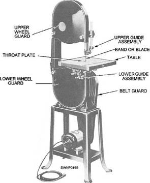 COMBINATION IRON WORKER The combination iron worker is likely the most valuable and versatile machine in a shop. The combination punch, shear, and coper (fig. 12-8) is capable of cutting angles, plates, and steel bars, and it can also punch holes. The size of the angles and plates that can be safely handled by the machine depends upon its capacity. It is manufactured in various sizes and capacities, and each machine has a capacity plate either welded or riveted on it. This guide should be strictly adhered to. The pressure and power the machine develops demand extreme caution on the part of the operator. VERTICAL BAND SAWS While the vertical band saw is designed primarily for making curved cuts, it can also be used for straight cutting. Unlike the circular saw, the band saw is frequently used for freehand cutting. The band saw has two large wheels on which a continuous narrow saw blade, or BAND, turns, just as a belt is turned on pulleys. The LOWER WHEEL, located below the WORKING TABLE, is connected to the motor directly or by means of pulleys or gears and serves as the driver pulley. The UPPER WHEEL is the driven pulley. The saw blade is guided and kept in line by two sets of BLADE GUIDES: one fixed set below the table and one set above with a vertical sliding adjustment. The alignment of the blade is adjusted by a mechanism on the back side of the upper wheel. TENSIONING of the blade-tightening and loosening-is provided by another adjustment located just back of the upper wheel. Cutoff gauges and ripping fences are sometimes provided for use with band saws. However, you will do most of your work freehand with the table clear because accurate cuts are difficult to make with a band saw when gauges or fences are used. The size of a band saw is designated by the diameter of the wheels. Thus the 14-inch model (fig. 12-9) has 14-inch wheels. Common sizes are 14-, 16-, 18-, 20-, 30-, 36-, 42-, and 48-inch machines. The 14-inch size is the smallest practical band saw. With the exception of capacity, all band saws are much alike in maintenance, operation, and adjustment. Blades, or bands, for bandsaws are designated by POINTS (tooth point per inch), THICKNESS (gauge), and WIDTH. The required length of the blade is found by adding the circumference of one wheel to twice the distance between the wheel centers. Length can vary within a limit of twice the tension adjustment range. Vertical band saws are comparatively simple machines to operate. Each manufacturer publishes a technical manual for their machine. Refer to the
