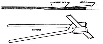 Figure 12-9.-14-inch band saw. Avoid twisting the blade by trying to turn sharp corners. Remember that you must saw around comers. If you want to saw a very small radius, use a narrow blade. If you find that a saw cut cannot be completed, it is better to saw out through the waste material to the edge of the stock than to back the blade out of the curved cut. This will prevent accidentally drawing the blade off the wheels. BAND SAW teeth are shaped like the teeth in a hand ripsaw, which means that their fronts are filed at 90 degrees to the line of the saw. Reconditioning procedures are the same as they are for a hand ripsaw, except that very narrow band saws with very small teeth must usually be set and sharpened by special machines. A broken band saw blade must be BRAZED when no accessory welder is available. The procedure for brazing is as follows: 1. SCARF the two ends to be joined with a file so that they may be joined in a SCARFJOINT(fig. 12-10). 2. Place the ends in a brazing clamp, or some similar device, that will permit them to be brought together in perfect alignments. 3. Coat the filed surfaces with soldering flux. 4. Cut a strip of silver solder the length of the scarf and the width of the blade. Coat it with flux and insert it between the filed surfaces. 5. Heat a pair of brazing tongs bright red and clamp the joint together. The red-hot tongs will heat the blade and melt the solder. Keep the tongs clamped on the joint until they turn black. 6. Smooth the joint on both sides with a flat file, and finish it with fine emery cloth. Figure 12-11 shows band ends being joined by using the butt welder-grinder unit. The entire procedure for joining is as follows: 1. Trim both ends of the band square; clean them thoroughly. Butt the ends together in the jaws of the welder-grinder unit; make sure that the ends are aligned and that the seam is centered between the welder jaws. First, set the resistance knob to agree with the dial for the width of band you are going to weld Then press and