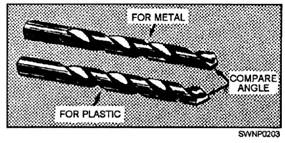 DRILL BITS Common drill bits are known as TWIST DRILLS because most of them are made by forging or milling rough flutes and then twisting them to a spiral configuration. After twisting, the drill bits are milled to the desired size and heat-treated. The general-purpose twist drill is made of highspeed steel. Figure 12-17 shows a typical plastic-cutting drill bit and a typical metal-cutting drill bit. Notice the smaller angle on the drill bit used for drilling plastics. Drill bit sizes are indicated in three ways: by inches, by letter, and by number. The nominal inch sizes run from 1/16 inch to 4 inches or larger. The letter sizes run from "A" to "Z" (0.234 inch to 0.413 inch).