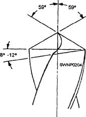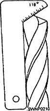 Figure 12-17.-Comparison of a twist drill for plastic and a twist drill for metal. The number sizes run from No. 80 to No. 1 (0.0135 inch to 0.228 inch). Before putting a drill bit away, wipe it clean and then give it a light coating of oil. Do not leave drill bits in a place where they maybe dropped or where heavy objects may fall on them. Do not place drill bits where they will rub against each other. A drill bit should be reground at the first sign of dullness. The increased load that dullness imposes on the cutting edges may cause a drill bit to break. Cutting Fluids When drilling steel and wrought iron, use a cutting oil. Cast iron, aluminum brass, and other metals may be drilled dry; therefore, at high-drilling speeds it is advisable to use some medium for cooling these metals to lessen the chances of overheating the drill bit with the resultant loss of the cutting edge. Compressed air may be used for cast iron; kerosene for aluminum; oleic acid for cooper; sulphurized mineral oil for Monel metal; and water, lard, or soluble oil and soda water for ferrous metals. (Soda water reduces heat, overcomes rust, and improves the finish.) Sharpening Drill Bits A drill bit becomes dull with use and must be resharpened. Continued use of a dull drill bit may cause it to break or bum up as it is forced into the metal. Improper sharpening will cause the same difficulties. Remove the entire point if it is badly worn or if the margins are burned or worn off near the point. If, by accident, the drill bit becomes overheated during grinding, do NOT plunge it into the water to cool. Allow it to cool in still air. The shock of sudden cooling may cause it to crack. Three factors must be considered when repainting a drill bit: 1. LIP CLEARANCE (fig. 12-18). The two cutting edges or lips are comparable to chisels. To cut effectively, you must relieve the heel or that part of the point back to the cutting edge. Wh.bout this clearance, it would be impossible for the lips to cut. If there is too much clearance, the cutting edges are weakened. Too little clearance results in the drill point merely rubbing without penetration. Gradually increase lip clearance toward the center until the line across dead center stands at an angle of 120 to 135 degrees with the cutting edge (fig. 12-19). 2. LENGTH AND ANGLE OF LIPS. The material to be drilled determines the proper point angle. The angles, in relation to the axis, must be the same. Fifty-nine degrees has been found satisfactory for most metals. If the angles are unequal, only one lip will cut and the hole will be oversize (fig. 12-20). 3. THE PROPER LOCATION OF THE DEAD CENTER (fig. 12-21). Equal angles but lips of different lengths results in oversize holes and the resulting "wobble" places tremendous pressures on the drill press spindle and bearings.