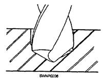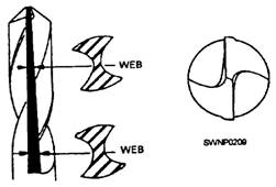 Figure 12-23.-The web of the drill bit and how the drill point is relieved by grinding. be thinned to minimize the pressures required to make the drill bit penetrate the material. The thinning must be done equally to both sides of the web, and care must be taken to ensure that the web is centered. The DRILL POINT GAUGE (fig. 12-24) is the tool most frequently used to check the drill point during the sharpening operation. Use a coarse wheel for roughing out the drill point if much metal must be ground away. Complete the operation on a fine wheel. Many hand sharpening techniques have been developed. The following are recommended: 1. Grasp the drill shank with the right hand and the rest of the drill bit with the left hand. 2. Place the fingers of the left hand that are supporting the drill bit on the grinder tool rest. The tool rest should be slightly below center (about 1 inch on a 7-inch wheel).