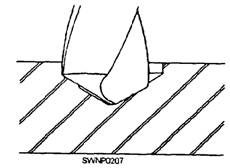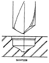 Figure 12-21.-Drill point off center. A combination of both faults can result in a broken drill bit, and if the drill bit is very large, permanent damage to the drilling machine. The hole produced (fig. 12-22) will be oversize and often out-of-round. The web of the drill bit increases in thickness toward the shank (fig. 12-23). When the drill bit has been shortened by repeated grindings, the web must