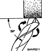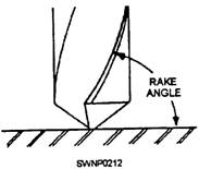 Figure 12-24.-Using a drill point gauge. 3. Stand so the centerline of the drill bit will be at a 59-degree angle with relation to the centerline of the wheel (fig. 12-25), and lightly touch the drill lip to the wheel in approximately a horizontal position. 4. Use the left hand as a pivot point and slowly lower the shank with the right hand. Increase the pressure as the heel is reached to ensure proper clearance. 5. Repeat the operation on each lip until the drill bit is sharpened. DO NOT QUENCH HIGH-SPEED STEEL DRILLS IN WATER TO COOL. LET THEM COOL IN CALM AIR. 6. Check the drill tip frequently with the drill point gauge to assue a correctly sharpened drill bit. Secure a drill bit that is properly sharpened and run through the motions of sharpening it. When you have acquired sufficient skill, sharpen a dull drill bit. To test, drill a hole in soft metal and observe the chip formation. When proper] y sharpened, the chips will come out of the flutes in curled spirals of equal length. The tightness of the chip spiral is governed by the RAKE ANGLE (fig. 12-26).