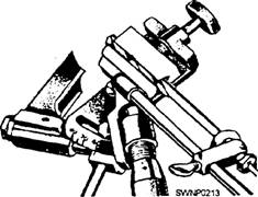 Figure 12-27.-A drill bit sharpening attachment mounted on a conventional bench grinder. transmission of compressed air over longer distances. This system is called air manifolding (fig. 12-28). An air manifold is a pipe having a large diameter used to transport compressed air from one or more compressors over a distance without detrimental friction line loss. In construction work, air manifolds are usually constructed of 6-inch diameter pipe. A pipe of this size can carry 1,200 cubic feet per minute (cfm) of air (output from two 600 cfm air compressors) at 100 psi with less than .035 pound pressure loss per 100 linear feet. One or more compressors pump air into the manifold and eventually "pressurize" it at 100 psi; then air may be used at any point along the manifold by installing outlet valves and connecting air lines and pneumatic tools. Compressor Operation and Maintenance The following paragraphs will give generaI instructions on operating and maintaining air compressor units. A compressor must be located on a reasonably level area. Most compressors permit a 15-degree lengthwise and a 15-degree sidewise limit on out-of-level operation. The limits are placed on the engine, not the actual compressor. When the unit is to be operated out-of-level, it is important to do the following: (1) keep the engine crankcase oil level near the high-level mark (with the unit level) and (2) have the compressor oil gauge show nearly full (with the unit on the level). An instruction plate, similar to the one shown in figure 12-29, is attached to all compressors. Notice that this plate refers you to the manufacturer's engine and compressor manuals for detailed instructions. STARTING THE UNIT.- Take the following steps when starting the engine during mild weather: