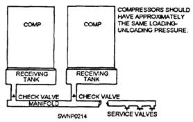A compressor is a machine for compressing air from an initial intake pressure to a higher exhaust pressure through reduction in volume. A compressor consists of a driving unit, a compressor unit, and accessory equipment. The driving unit provides power to operate the compressor and may be a gasoline or diesel engine. Compressors are governed by a pressure control system adjusted to compress air to a maximum pressure of 100 psi. Compressed Air System A compressed air system consists of one or more compressors, each with the necessary power source, control of regulation, intake air filter, aftercooler, air receiver, and connecting piping, together with a distribution system to carry the air to points of use. The object of installing a compressed air system is to provide sufficient air at the work area at pressures adequate for efficient operation of pneumatic tools being used. Many construction projects require more cubic feet of air per minute than any one compressor will produce. Terrain conditions often create problems of distance from the compressor to the operating tool. Since the air line hose issued with the compressor causes considerable line loss at distances farther than 200 feet, a system has been devised for efficient