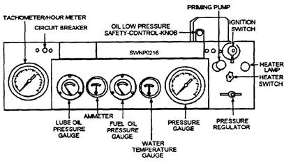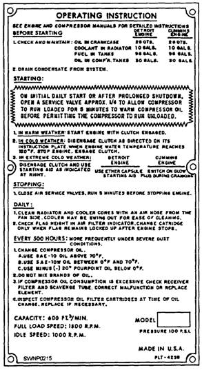Figure 12-29.-Operating Instruction plate. 1. Open the service valves about one quarter-not wide open. NOTE: The reason for starting with the service valves partly open is that they aid in quicker warm-up of the compressor oil. 2. Position the low-pressure, engine-oil-system safety knob to ON (fig. 12-30). 3. Turn the ignition switch to the START position. Immediately after the engine starts, release the ignition switch. If the engine fails to fire within 30 seconds, release the ignition switch and allow the starting motor to cool off for a few moments before trying the starter again. 4. With the engine running, check the engine oil pressure gauge. If no pressure is indicated, turn the engine off. When the oil pressure goes above 22 psi, continue to operate the engine and check the low-pressure engine oil switch. The knob on this switch should be in the RUN position. NOTE: The engine oil pressure gauge indicates erratically until the engine oil warms up. 5. Open the side curtains on both sides of the engine enclosure and leave them open. The flow of air through the oil cooler and engine radiator will be impeded if the side curtains are closed while the engine is running. 6. After the engine has run about 3 minutes, check the engine coolant temperature gauge. The gauge should indicate less than 210F. If the gauge is showing more than 210F, SHUT OFF THE ENGINE.