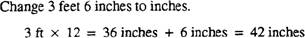 CHANGING FEET AND INCHES TO INCHES To change feet and inches to inches, multiply the number of feet by 12 and add the number of inches. The result will be inches. Example: