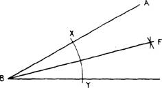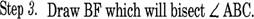 Solution: Step 1. Draw an arc with the radius less than the shorter of AB or BC intersecting AB and BC at points X and Y. Step 2. From X and Y using the same radius, draw arcs intersecting at point F.