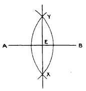 Solution: Step 1. Using A as a center and a radius more than 1/2 of AB, but less than AB, draw an arc. Step 2. Using B as a center and the same radius as Step 1, draw an arc intersecting the arc drawn in Step 1. Mark intersecting points X and Y. Draw XY. Conclusion: AE = EB NOTE: That E also represents the midpoint of XY and that XY is perpendicular to AB. XY is termed the perpendicular bisector of AB, CONSTRUCTION OF PARALLEL LINES USING PERPENDICULARS Example; Construct parallel lines 2" apart.