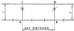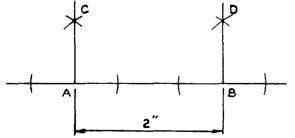 Solution: Step 1. Draw a base line and lay out two points A and B 2" apart. Step 2. Construct perpendiculars AC and BD to AB at A and B. Conclusion; AC is parallel to BD. Principle: Perpendiculars to the same line are parallel. NOTE: Horizontal parallel lines can be drawn by the same procedures.
