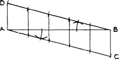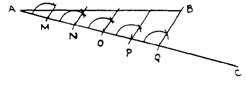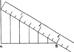 Solution: Step 1. At A draw a line perpendicular to AB. Step 2. Place the scale at an angle so that the distance on the scale will divide easily into 6 parts. In the above, we have selected 3" which will divide into 6 equal parts of 1/2" each. Step 3. Draw lines from 1/2"; each division is perpendicular to AB. Conclusion: The perpendiculars drawn will divide AB into 6 equal parts. |