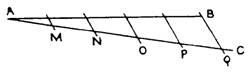 Solution: Step 1. At any assumed angle draw AC. Step 2. Step off 5 equal parts on AC. Step 3. At Q (the end of 5 parts), draw line BQ. Step 4. Draw lines through P, 0, N, and M parallel to BQ. Conclusion: Where parallel lines intersect AB, AB will be divided into 5 equal parts. Note the similarity of methods 3 and 2. 4. Use of a scale Example: Divide line AB, which is 29/16" long, into 6 equal parts.