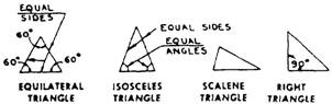 TRIANGLES A triangle is a plane shape having 3 sides. Its name is derived from its three (tri) angles. Other facts help define a triangle. 1. The sum of the angles in any triangle equals 180. 2. A triangle is the only plane shape which maybe defined in terms of its sides only; in all others one or more angles must be stated. Types of Triangles There are four kinds of triangles. They are classified according to the size of their sides and angles as follows: 1. Equilateral-all sides are equal-all angles are equal-all angles are 60 2. Isosceles-two sides equal-two angles equal 3. Scalene-all sides unequal-all angles unequal 4. Right-one right angle