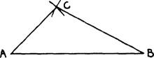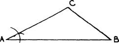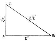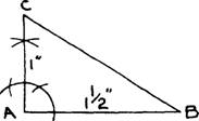 Solution: Step 1. Draw AB 1 1/2" long. Step 2. At A, erect a perpendicular to AB. Step 3. Locate point C 1" from AB and complete the triangle. Conclusion: Triangle ABC is a right triangle, 5. A right triangle maybe constructed by making the sides 3", 4", and 5" or multiples or fractions thereof. Problem: Construct a right triangle with sides of 1 1/2", 2", and 2 1/2" (1/2 of 3,4, and 5). Solution: Step 1. Draw line AB = 2". Step 2. From A, draw an arc equal to 1 1/2". Step 3. From B, draw an arc equal to 2 1/2". Conclusion: Triangle ABC is a right triangle,