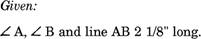 Solution: Step 1. Draw a base line equal to one of the sides. Mark the ends of lines A and B. Step 2. Set the compass equal to the second side (1" in the above) and swing an arc from A. Step 3. Set the compass equal to the third side (1 1/2" in this case) and swing an arc. Conclusion: The intersection of these two arcs will be the vertex C and will complete triangle ABC. 2. A triangle maybe constructed if two sides and the included angle (angle between the sides) are known. Problem: To construct a triangle with two sides and the included angle known. Given: Two sides 1 1/2" and 2 1/4" and the included angle.