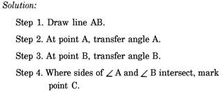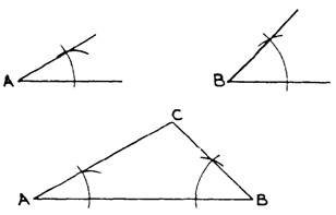Solution: Step 1. Draw the base equal to one side. Step 2. Construct an angle equal to the given angle. Step 3. Measure the second side on the side of the angle and connect the ends of the given sides BC. Conclusion: Triangle ABC has been constructed with two sides and the included angle given. 3. A triangle maybe constructed if two angles and the included side are given. Problem: Construct a triangle.