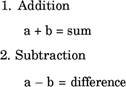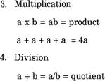 ADDITION AND SUBTRACTION OF MATHEMATICAL SYMBOLS 1. The sum of any two symbols, a and b, is written a+b. 2. The difference of any two symbols, a being the greater and b being the smaller, is written a -b. MULTIPLICATION OF MATHEMATICAL SYMBOLS 1. The product of any two symbols, a and b, is written as a x b or ab. 2. The sum of any number of like symbols, such as a+ a + a + a, may be combined and written once, preceded by a numeral designating the number of times the symbol occurs, as 4a. DIVISION OF MATHEMATICAL SYMBOLS The quotient of any two symbols a and b where a is the dividend and b is the divisor maybe written a/b. Summary