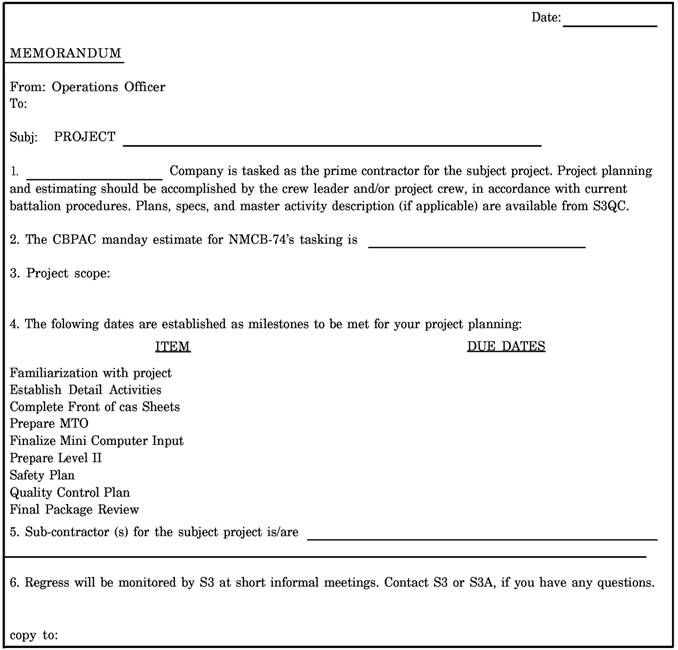 PROJECT FOLDERS The intent of this section is to acquaint you with the basic concepts and principles of project management and is NOT intended to be a reference but also to make you familiar with the contents of a project folder. The project folder, or package, consists of nine individual project files. These files represent the project in paper format-a type of project history from start to finish. File No. 1-General Information File File No. 1 is the General Information File and contains the following information: LEFT SIDE-The left side of the General Information File basically contains information authorizing the project. The file should have the following items: Project scope sheet. Tasking letter (fig. 1-12). Project planning checklist. Project package sign-off sheet. RIGHT SIDE-The right side of the General Information File contains basic information relating to coordinating the project. The file should have the following items: Project organization. Deployment calendar. Preconstruction conference notes. Predeployment visit summary. File No. 2-Correspondence File File No. 2 is the Correspondence File and consists of the following items: LEFT SIDE-The left side contains outgoing messages and correspondence. RIGHT SIDE-The right side of the file contains incoming messages and correspondence.