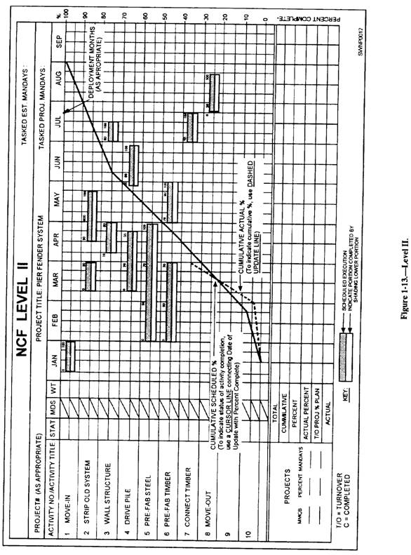 File No. 3-Activity File File No. 3, the Activity File, contains the following information: LEFT SIDE-The left side contains the Construction Activity Summary Sheets of completed activities. RIGHT SIDE-The right side of the file contains the following form sheets: Master Activity Sheets. Level II. A general schedule for each project prepared for the operations officer by the company. It contains a general schedule for each project and contains all of the major work elements and a schedule for each prime contractor or project manager based upon major work (fig. 1-13). Level II Precedence Diagram. Master Activity Summary Sheets (fig. 1-14). Construction Activity Summary Sheets (fig. 1-15). File No. 4-Network File File No. 4 is the Network File. It contains the following information: LEFT SIDE-The left side contains the following documents: Computer printouts. Level III is a detailed schedule fore each project, developed by the company selected as prime contractor and assisted by the companies selected as subcontractor. The Level III not only serves as stool in which the prime contractor and subcontractor manage their projects but it also provides important data, enabling the operations officer to redistribute or reschedule assignments and to arrange for extra personnel, equipment, or special training required for the task. Level III shows such details as crew sizes, material delivery dates, and periods where special tools/equipment will be required on the project. Level III Precedence Diagram. RIGHT SIDE-The right side of the Network File contains the following items: Resource leveled plan for manpower and equipment. Equipment requirement summary. File No. 5-Material File File No. 5 is the Material File. It contains the following information: LEFT SIDE-The left side contains the work sheets that you, as a project planner, must assemble. THe list includes the following items: List of long lead items (fig. 1-16). 45-day material list. Material transfer list. Add-on/reorder justification forms. Bill of Material/Material Takeoff Comparison Work Sheet (fig. 1-17). Material Takeoff Work Sheet (fig. 1-18). RIGHT SIDE-The right side of the Material File contains the Bill of Material (including all add-on/reorder BMs) supplied by the Naval Construction Regiment. File No. 6-Quality Control File File No. 6, the Quality Control File, contains the following information: LEFT SIDE-The left side of this file contains various quality control forms and the field adjustment request. RIGHT SIDE-The right side of the Quality Control File contains the daily quality control inspection report and the quality control plan. File No. 7-Safety/Environmental File File No. 7 is the Safety/Environmental File and consists of the following information: LEFT SIDE-The left side of the Safety/ Environmental File contains the following items: Required safety equipment. *Standup safety lectures. Safety reports. Accident reports. RIGHT SIDE-The right side of the Safety/ Environmental File contains the following: Safety plan, which you must develop. Highlighted EM 385. Environmental plan (if applicable). File No. 8-Plans File File No. 8 is the Plans File and contains the following information: