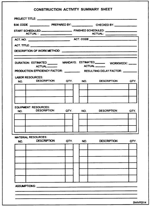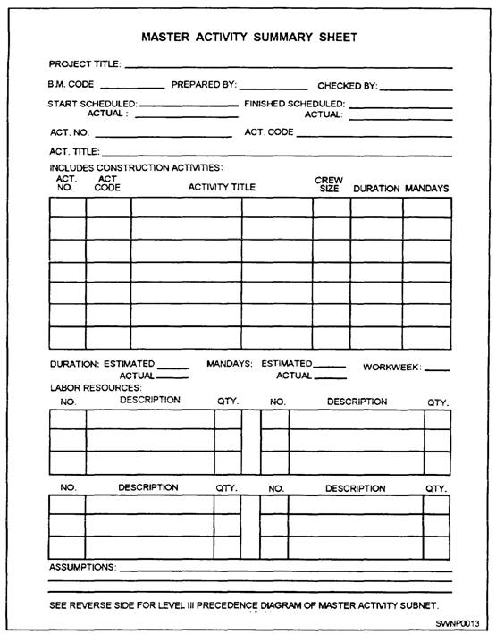 Figure 1-14.-Master Activity Summary Sheet. LEFT SIDE-The left side contains the following planning documents: Site layout. Shop drawings. Detailed slab layout drawings (if applicable). Rebar bending schedule. RIGHT SIDE-The right side of the Plans File contains the actual project plans. Depending on thickness, plans should be either rolled or folded. File No. 9-Specifications File File No. 9 is the Specifications File; it contains the following information: