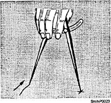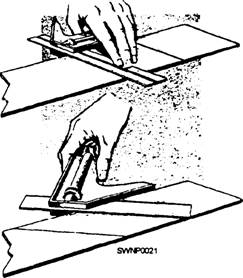 Figure 2-1-Scribing a line. Complete the line by scribing from the other prick punch mark in the opposite direction. Flat Steel Square The FLAT STEEL SQUARE is a desirable tool for constructing perpendicular or parallel lines. In the method of layout, known as parallel line development, the flat steel square is used to construct lines that are parallel to each other as well as perpendicular to the base line. This procedure is shown in figure 2-2. Simply clamp the straightedge firmly to the base line. Slide the body of the square along the straightedge, and then draw perpendicular lines through the desired points. Before using the flat steel square or at least at periodic intervals, depending on usage, see that you check it for accuracy, as shown in figure 2-3. When the square is off, your work will be off correspondingly no matter how careful you are. Combination Square The COMBINATION SQUARE can be used to draw a similar set of lines, as shown in figure 2-4. An edge of the metal upon which you are working is used as the base line, as shown in the figure. One edge of the head of the combination square is 90 degrees and the other edge is 45 degrees. Combination squares are