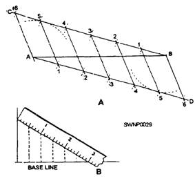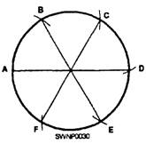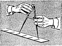 Figure 2-12.-Two methods used to divide a line into equal parts. point A, draw a straight line tangent to the arc that is below point B. Do the same from point B. With the dividers set at any given distance, start at point A and step off the required number of spaces along line AD using tick marks-in this case, six. Number the tick marks as shown. Do the same from point B along line BC. With the straightedge, draw lines from point 6 to point A, 5 to 1, 4 to 2, 3 to 3, 2 to 4, 1 to 5, and B to 6. You have now divided line AB into six equal parts. When the method shown in view B of figure 2-12 is used to divide a line into a given number of equal parts, you will need a scale. In using this method, draw a line at right angles to one end of the base line. Place the scale at such an angle that the number of spaces required will divide evenly into the space covered by the scale. In the illustration (view B, fig. 2-12) the base line is 2 1/2 inches and is to be divided into six spaces. Place the scale so that the 3 inches will cover 2 1/2 inches on the base line. Since 3 inches divided by 6 spaces = 1/2 inch, draw lines from the 1/2-inch spaces on the scale perpendicular to the base line. Incidentally, you may even use a full 6 inches in the scale by increasing its angle of slope from the baseline and dropping perpendiculars from the full-inch graduation to the base line. To divide or step off the circumference of a circle into six equal parts, just set the dividers for the radius of the circle and select a point of the circumference for a beginning point. In figure 2-13, point A is selected for a beginning point. With A as a center, swing an arc through the circumference of the circle, like the one shown at B in the illustration. Use B, then, as a point, and swing an arc through the circumference at C. Continue to step off in this manner until you have divided the circle into six equal parts. If the points of intersection between the arcs and the circumference are connected as shown in figure 2-13, the lines will intersect at the center of the circle, forming angles of 60 degrees. If you need an angle of 30 degrees, all you have to do is to bisect one of these 60-degree angles by the method described earlier in this chapter. Bisect the 30-degree angle and you have a 15-degree angle. You can construct a 45-degree angle in the same manner by bisecting a 90-degree angle. In all probability, you will have a protractor to lay out these and other angles. But just in case you do not have a steel square or protractor, it is a good idea to know how to construct angles of various sizes and to erect perpendiculars. Many times when laying out or working with circles or arcs, it is necessary to determine the circumference of a circle or arc. For the applicable mathematical formula, refer to appendix II of this text. Circumference Rule Another method of determining circumference is by use of the circumference rule. The upper edge of the circumference rule is graduated in inches in the same manner as a regular layout scale, but the lower edge is graduated, as shown in figure 2-14. The lower edge gives you the approximate circumference of any circle within the range of the rule. You will notice in figure 2-14 that the reading on the lower edge directly below the 3-inch mark is a little over 9 3/8 inches. This