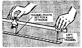 Figure 2-4.-Using the combination square delicate instruments and are of little value if you handle them roughly. Store your squares properly when you have finished using them. Keep them clean and in tiptop shape, and you will be able to construct 90-degree angles, 45-degree angles, and parallel lines without error. Protractor To construct angles other than 45 degrees or 90 degrees, you will need a PROTRACTOR. Mark the vertex of the angle of your base line with a prick punch. Set the vertex of your protractor on the mark and then scribe a V at the desired angle (assume 700). Scribe the line between the vertex and the point located by the V, and you have constructed an angle of 70 degrees. Prick Punch When you locate a point and mark it with the PRICK PUNCH, be sure to use alight tap with a small ball peen hammer, ensuring it is on the precise spot intended to mark. The smaller the mark you make (so long as it is visible), the more accurate that mark becomes. Dividers You should use DIVIDERS to scribe arcs and circles, to transfer measurements from a scale to your layout, and to transfer measurements from one part of the layout to another. Careful setting of the dividers is of utmost importance. When you transfer a measurement from a scale to the work, set one point of the dividers on the mark and carefully adjust the other leg to the required length, as shown in figure 2-5. To scribe a circle, or an arc, grasp the dividers between the fingers and the thumb, as shown in figure 2-6. Place the point of one leg on the center, and swing the arc. Exert enough pressure to hold the point on center, slightly inclining the dividers in the direction in which they are being rotated. TrammelPoints To scribe a circle with a radius larger than your dividers, you should select TRAMMEL POINTS. The method of adjusting the points, as shown in figure 2-7, is to set the left-hand point on one mark, slide the right-hand point to the required distance, and tighten the thumbscrew. The arc, or circle, is then scribed in the same manner as with the dividers. Constructing a 90-degree, or right, angle is not difficult if you have a true, steel square. Suppose that you have no square or that your square is off and you