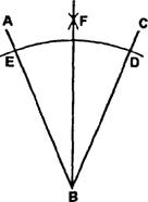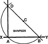 Figure 2.9.-Constructing a 90-degree angle at a given point Imagine that you have line XY with A as a point at which you need to fabricate a perpendicular to form a right angle. Select any convenient point that lies somewhere within the proposed 90-degree angle. In figure 2-9 that point is C. Using C as the center of a circle with a radius equal to CA, scribe a semicircular are, as shown in figure 2-9. Lay a straightedge along points B and C and draw a line that will intersect the other end of the are at D. Next, draw a line connecting the points D and A and you have fabricated a 90-degree angle. This procedure may be used to form 90-degree comers in stretch-outs that are square or rectangular, like a drip pan or a box. Laying out a drip pan with a pair of dividers is no more difficult than fabricating a perpendicular. You will need dividers, a scriber, a straightedge, and a sheet of template paper. You have the dimensions of the pan to be fabricated: the length, the width, and the height or depth. Draw a base line (fig. 2-10). Select a point on this line for one comer of the drip pan layout. Erect a perpendicular through this point, forming a 90-degree angle. Next, measure off on the base line the required length of the pan. At this point, erect another perpendicular. You now have three sides of the stretch-out. Using the required width of the pan for the other dimensions, draw the fourth side parallel to the base line, connecting the two perpendiculars that you have fabricated. Now, set the dividers for marking off the depth of the drip pan. You can use a steel scale to measure off the correct radius on the dividers. Using each comer for a point, swing a wide are, like the one shown in the second step in figure 2-10. Extend the end and side lines as shown in the last step in figure 2-10 and complete the stretch-out by connecting the arcs with a scriber and straightedge. Bisecting an are is another geometric construction that you should be familiar with. Angle ABC (fig. 2-11) is given. With B as a center, draw an are cutting the sides of the angle at D and E. With D and E as centers and a radius greater than half of are DE, draw arcs intersecting at F. A line drawn from B through point F bisects angle ABC. Two methods used to divide a line into a given number of equal parts are shown in figure 2-12. When the method shown in view A is to be used, you will need a straightedge and dividers. In using this method, draw line AB to the desired length. With the dividers set at any given radius, use point A as center and scribe an arc above the line. Using the same radius and B as center, scribe an are below the line as shown. From