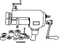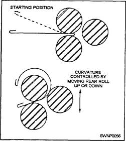 ROLL FORMING MACHINE.- When cylinders and conical shapes are being formed, no sharp bends are obviously required; instead, a gradual curve has to be formed in the metal until the ends meet. Roll forming machines have been invented to accomplish this task. The simplest method of forming these shapes is on the SLIP ROLL FORMING MACHINE (fig. 2-38). Three rolls do the forming (fig. 2-39). The two front rolls are the feed rolls and can be adjusted to accommodate various thicknesses of metal. The rear roll, also adjustable, gives the section the desired curve. The top roll pivots up to permit the cylinder to be removed without danger of distortion. Grooves are machined in the two bottom