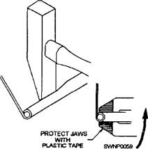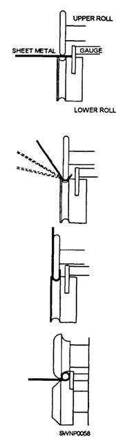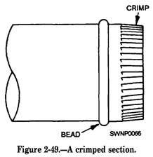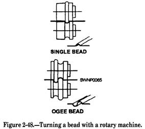 Figure 2-47.-Making a double seam on a cylindrical section. Beading. - BEADING (fig. 2-48) is used to give added stiffness to cylindrical sheet-metal objects for decorative purposes, or both. It can be a simple bead or an ogee (S-shaped) bead. They are made on the rotary machine using beading rolls. Crimping.- CRIMPING (fig. 2-49) reduces the diameter of a cylindrical shape, allowing it to be slipped into the next section. This eliminates the need for making each cylinder with a slight taper.