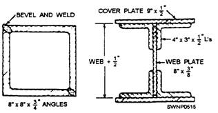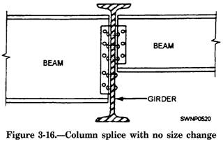Figure 3-11.-Built-up column section. such that the joints or splices are 1 1/2 to 2 feet above the second and succeeding story levels. This will ensure that the splice connections are situated well above the girder or beam connections so that they do not interfere with other second story work. Column splices are joined together by splice plates which are bolted, riveted, or welded to the column flanges, or in special cases, to the webs as well. If the members are the same size, it is common practice to butt one end directly to the other and fasten the splice plates over the joint, as illustrated in figure 3-12. When the column size is reduced at the joint, a plate is used between the two ends to provide bearing, and filler plates are used between the splice plates and the smaller column flanges (fig. 3-13). GIRDERS Girders are the primary horizontal members of a steel frame structure. They span from column to