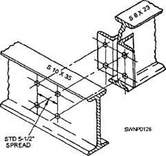 Figure 3-32.-Fabrication and fit-up for joining two beams of the same size. intersecting beam is smaller; therefore, only one flange is coped to fit the other. The top flanges will be flush. Note that the angles on this connection are to be bolted, rather than welded. CONNECTION ANGLE LAYOUT A very common connection with framed construction is the connection angle. The legs of the angles used as connections are specified according to the surface to which they are to be connected. The legs that attach to the intersecting steel to make the connections are termed web legs. The legs of the angles that attach to the supporting or intersected steel beam are termed outstanding legs. The lines in which holes in the angle legs are placed are termed gauge lines. The distances between gauge lines and known edges are termed gauges. An example of a completed connection is shown in figure 3-34. The various terms and the constant dimensions for a standard connection angle are shown in figure 3-35.