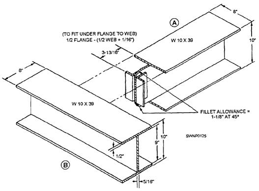 LAYOUT OF STRUCTURAL SHAPES Structural shapes are slightly more difficult to lay out than plate. This is because the layout lines may not be in view of the layout person at all times. Also, the reference line may not always be in view. Steel beams are usually fabricated to fit up to another beam. Coping and slotting are required to accomplish this. Figure 3-32 shows two W 10 x 39 beams being fitted up. Beam A is intersecting beam B at the center. Coping is required so beam A will butt up to the web of beam B; the connecting angles can be welded to the web, and the flanges can be welded together. A cut 1 1/8 inches (2.8 cm) long at 45 degrees at the end of the flange cope will allow the web to fit up under the flange of beam B and also allow for the fillet. The size of the cope is determined by dividing the flange width of the receiving beam in half and then subtracting one half of the thickness of the web plus 1/16 inch. This determines how far back on beam A the cope should be cut. When two beams of different sizes are connected, the layout on the intersecting beam is determined by whether it is larger or smaller than the intersected beam. In the case shown in figure 3-33, the