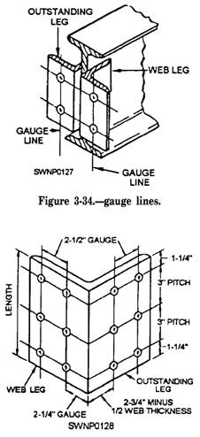 Figure 3-35.-Standard layout for connection angle using 4-inch by 4-inch angle The distance from the heel of the angle to the first gauge line on the web leg is termed the web leg gauge. This dimension has been standardized at 2 1/4 inches (5.6 cm). THIS DIMENSION IS CONSTANT AND DOES NOT VARY. The distance from the heel of the angle to the first gauge line on the outstanding leg is called the outstanding leg gauge. This dimension varies as the thickness of the member, or beam, varies. This variation is necessary to maintain a constant 5 1/2-inch-spread dimension on the angle connection. The outstanding leg gauge dimension can be determined in either one of the following two ways: 1. Subtract the web thickness from 5 1/2 inches (13.8 cm) and divide by 2. 2. Subtract 1/2 of the web thickness from 2 3/4 inches. The distance between holes on any gauge line is called pitch. This dimension has been standardized at 3 inches (7.5 cm). The end distance is equal to one half of the remainder left after subtracting the total of all pitch spaces from the length of the angle. By common practice, the angle length that is selected should give a 1 1/4-inch (3-cm) end distance. All layout and fabrication procedures are not covered in this section. Some examples are shown in figure 3-36. Notice that the layout and fabrication yard has a table designed to allow for layout, cutting, and welding with minimum movement of the structural members. The stock materials are stored like kinds of materials. The table holds two columns being fabricated out of beams with baseplates and cap plates. Angle clips for seated connections (fig. 3-37) should be installed before erection, |
