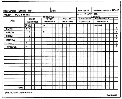 CATEGORIES OF LABOR The type of labor performed must be broken down and reported by category to show how labor has been used. For timekeeping and labor reporting purposes, all labor is classified as either productive or overhead. Productive Labor PRODUCTIVE LABOR includes labor that directly or indirectly contributes to the accomplishment of the mission of the unit, including construction operations, military operations, and training. Productive labor is accounted for in three categories: direct labor, indirect labor, and military, which is called "other" on some timekeeping cards. 1. DIRECT LABOR includes labor expended directly on assigned construction tasks either in the field or in the shop that contributes directly to the completion of an end product. Direct labor must be reported separately for each assigned construction task. 2. INDIRECT LABOR comprises labor required to support construction operations but does not produce an end product itself. 3. MILITARY or "Other" includes military functions and training necessary to support the mission. Overhead Labor OVERHEAD LABOR is not considered to be productive labor because it does not contribute directly or indirectly to the completion of an end product. Included is labor that must be performed regardless of the assigned mission. LABOR CODES During the planning and scheduling of a construction project, each phase of the project considered as direct labor is given an identifying code. Because there are many types of construction projects involving different operations, codes for direct labor reporting can vary from one activity to another. For example, excavating and setting forms can be assigned code R-15; laying block, code R- 16; and installing bond beams, code R-17. You will use direct labor codes to report each hour spent by each of your crew members during each workday on assigned construction tasks. Codes are also used to report time spent by crew members in the following categories: indirect labor, military operations and readiness, disaster control operations, training, and overhead labor. The codes shown in figure 1-3 are used at most activities to indicate time spent in these categories. TIMEKEEPING CARDS Your report is submitted on a Daily Labor Distribution Report form (timekeeping card), like the one shown in figure 1-4. The form provides a breakdown by man-hours of the activities in the various labor codes for each crew member for each