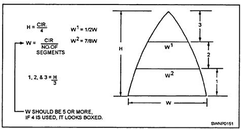 TEMPLATE LAYOUT FOR TRUE Y BRANCHES AND MAIN LINES Inlaying out a template for a true Y, a drawing of the intersection should be made, as shown in figure 3-56, view A. After drawing the lines of intersection, the same essential methods as for other templates are followed. Note that here it is suggested the equally divided semicircumferences are more conveniently placed directly on the base line. The distances from the base line to the line of intersection plotted on the unwrapped base line determine the template. ORANGE PEEL HEAD A number of different types of heads are used in welded pipe construction. Here, we are interested in one general type, the ORANGE PEEL, since it will often concern you in your work. A main advantage of the orange peel is that it has high strength in resisting internal pressure. If templates or tables are not available for making an orange peel head, a reasonably accurate marking can be secured by the following procedure for laying out a template. The number of arms to make an orange peel head should be the minimum number which can be easily bent over to form the head. Five arms and welds are the recommended minimum for any pipe; this number should be increased for larger sizes of pipe. Dividing the circumference by 5 is a good method for deciding the number of arms, provided, there are at least 5. To lay out the template, draw the side and end views (fig. 3-57). Divide the pipe circumference in view B into the same number of equal parts as it is planned to have welds, and draw the radial lines o-a, o-b, and so on. Project the points a, b, and so on, in this view.
