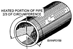 Figure 3-65.-90-degree bend made with ten separate wrinkles. Wrinkle bending has been successful on pipe of more than 20 inches in diameter. Experience has shown that, for 7-inch-diameter pipe and over, more complete and even heating is accomplished using two welding torches, rather than one. In any event, the heating procedure is the same-the torch or torches being used to heat a strip approximately two thirds of the circumference of the pipe (fig. 3-66). The heated strip need not be very wide (2 to 3 inches, or 5.08 to 7.62 cm, is usually sufficient) since the bend will only be through 12 degrees at most. The heated portion, as we have noted, is the part which will compress to become the inside of the bend. The portion which is not heated directly will form the outside of the bend. The technique most often used to bend the pipe, once it has been heated, is simple and straightforward. The pipe is merely lifted up by hand (or by tackle), while the other end is held firmly in position.