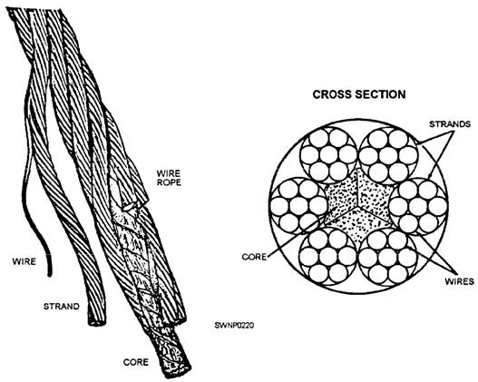 CHAPTER 5 WIRE ROPE Wire rope is stronger, lasts longer, and is much more resistant to abrasion than fiber line. Because of these factors, wire rope is used for hoisting tasks that are too heavy for fiber line to handle. Also, many of the movable components on hoisting devices and attachments are moved by wire rope. Wire rope is an intricate device made up of a number of precise moving parts. The moving parts of wire rope are designed and manufactured to maintain a definite relationship with one another. This relationship ensures that the wire rope has the flexibility and strength crucial to professional and safe hoisting operations. WIRE ROPE This chapter discusses the construction, the characteristics and specifications, and the criteria used for the selection of wire rope. The related attachments and the proper handling procedures for wire rope are also discussed. NOTE: In the Navy, you may hear wire rope referred to as wire or rope but never as line. WIRE ROPE CONSTRUCTION Wire rope is composed of three parts: wires, strands, and core (fig. 5-1). A predetermined number of wires of the same or different size are fabricated in a uniform arrangement of definite lay to form a strand. The required number of strands is then laid together symmetrically around the core to form the wire rope. Wires The basic component of the wire rope is the wire. The wire may be made of steel, iron, or other metal in various sizes. The number of wires to a strand varies,
