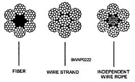 Figure 5-3.-Core construction. cushion to reduce the effects of sudden strain and act as an oil reservoir to lubricate the wire and strands (to reduce friction). Wire rope with a fiber core is used when flexibility of the rope is important. A wire strand core resists more heat than a fiber core and also adds about 15 percent to the strength of the rope; however, the wire strand core makes the wire rope less flexible than a fiber core. An independent wire rope core is a separate wire rope over which the main strands of the rope are laid. This core strengthens the rope, provides support against crushing, and supplies maximum resistance to heat. When an inspection discloses any unsatisfactory conditions in a line, ensure the line is destroyed or cut into small pieces as soon as possible. This precaution prevents the defective line from being used for hoisting. Wire rope may be manufactured by either of two methods. When the strands or wires are shaped to conform to the curvature of the finished rope before laying up, the rope is termed preformed wire rope.