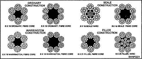 Figure 5-1.-Fabrication of wire rope depending on what purpose the wire rope is intended. Wire rope is designated by the number of strands per rope and the number of wires per strand. Thus a 1/2-inch 6 by 19 wire rope has six strands with 19 wires per strand. It has the same outside diameter as a 1/2-inch 6 by 37 wire rope that has six strands with 37 wires (of smaller size) per strand. Strands The design arrangement of a strand is called the construction. The wires in the strand may be all the same size or a mixture of sizes. The most common strand constructions are Ordinary, Scale, Warrington, and Filler (fig. 5-2). Ordinary construction wires are all the same size. Scale is where larger diameter wires are used on the outside of the strand to resist abrasion and smaller wires are inside to provide flexibility. Warrington is where alternate wires are large and small to combine great flexibility with resistance to abrasion. Filler is where small wires fill in the valleys between the outer and inner rows of wires to provide good abrasion and fatigue resistance. Core The wire rope core supports the strands laid around it. The three types of wire rope cores are fiber, wire strand, and independent wire rope (fig. 5-3). A fiber core maybe a hard fiber, such as manila, hemp, plastic, paper, or sisal. The fiber core offers the advantage of increased flexibility. It also serves as a