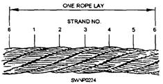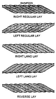 Figure 5-4.-Lays of wire rope. strand. Lay length measurement is shown in figure 5-5. CLASSIFICATION OF WIRE ROPE The primary types of wire rope used by the NCF consist of 6, 7, 12, 19, 24, or 37 wires in each strand. Usually, the wire rope has six strands laid around the core . The two most common types of wire rope, 6 by 19 and 6 by 37, are shown in figure 5-6. The 6 by 19 type (having six strands with 19 wires in each strand) is the stiffest and strongest construction of the type of wire rope suitable for general hoisting operations. The 6 b y 37 wire rope (having six strands with 37 wires in each strand) is flexible, making it suitable for cranes and similar equipment where sheaves are smaller than